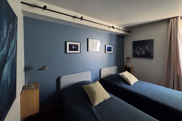 With its blue ambiance inspired by the Mediterranean seabed, this cozy room with twin beds invites you on a journey.